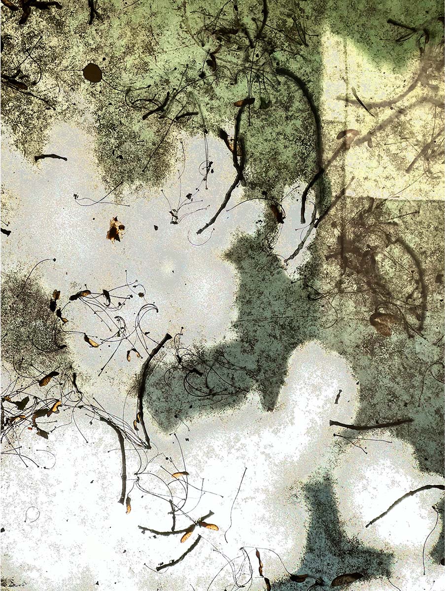 Sometimes it pays to look up! I was walking in downtown Portland, the sun was out, it was early afternoon and there had been some rain a few days earlier. As I passed by an awning above my head, I looked up to see a semi-clear plastic cover embedded with organic debris on its top side. From underneath, I shot close to the awning as I could get and this is the result. I continue to find patterns embedded in this image and it just all seems to work from a compositional level!