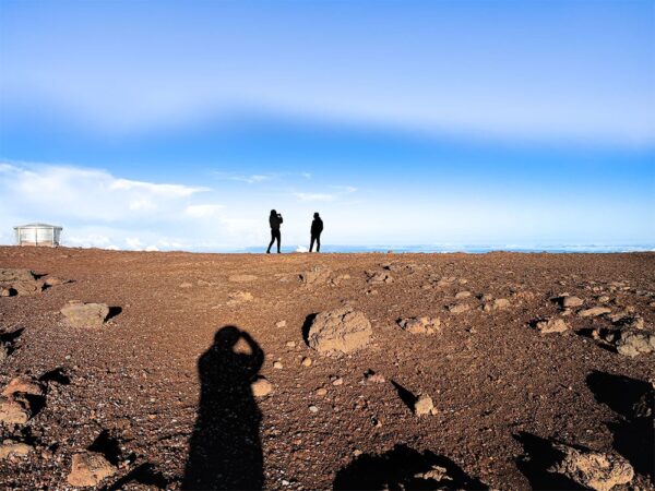 Almost like a moon landing site, within its immediate rock and sky surroundings, two people standing in the distance, one taking a picture of the other as a shadow is cast by the photographer who is an outside observer. It’s a bit surreal within a surreal environment. Ironic, this observatory is one of best places on earth to view the distant cosmos because of its high altitude and low light pollution at night, yet its own immediate surroundings are so otherworldly.