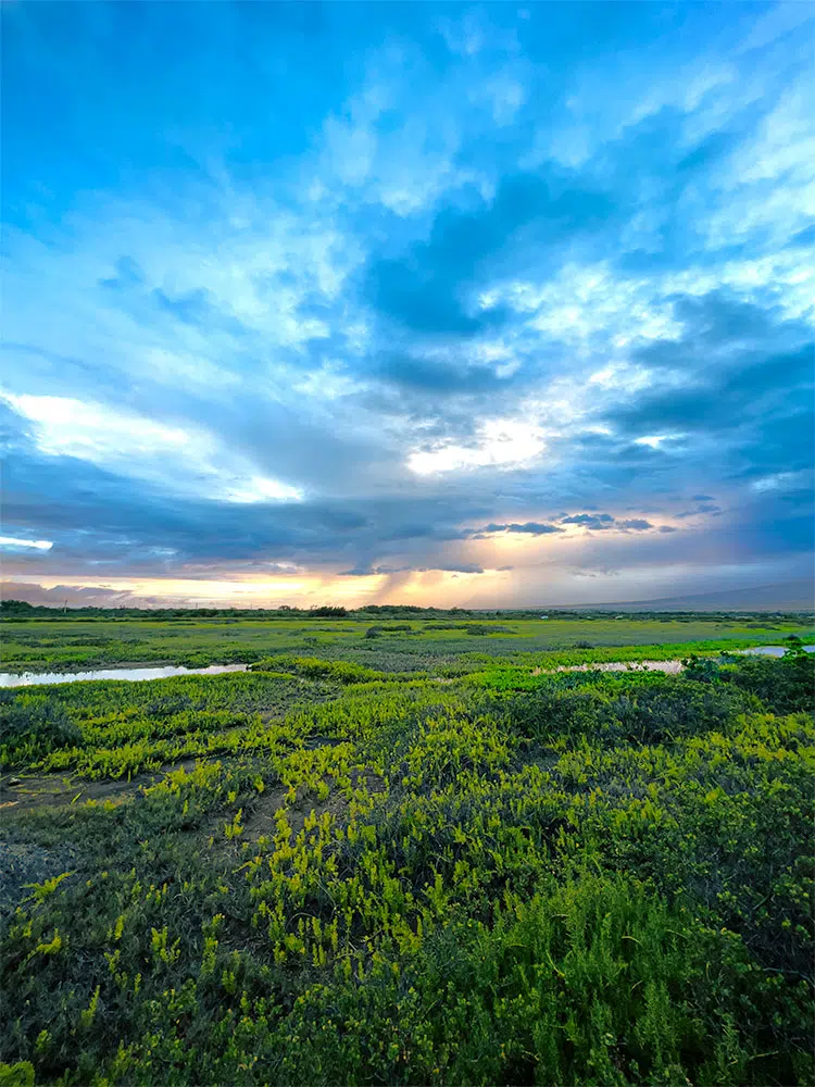 The early rays of the day were shining through the clouds. A portion of the clouds look like a twister extending down to the verdant field below. It’s hard not to find beauty in Maui, this picture needed some adjustments mostly in lightening up the green field and adding a little yellow to offset the the deep blue of the clouds. I included the unedited image in the gallery for a comparison between the start and the finish.